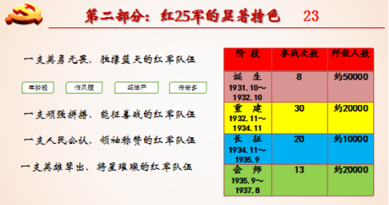 (三)长征路,屡创佳绩。红25军在长征途中创下了一个“第一”、四个“唯一”。