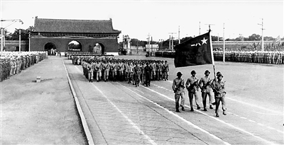 1949年10月1日开国大典上,受阅部队擎着“八一”军旗走过天安门广场。