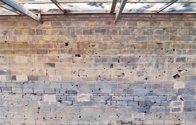 宋庄战斗遗址内一面布满弹孔的墙壁。资料照片