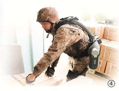 图④:穿戴“机械甲”搬运军用品。