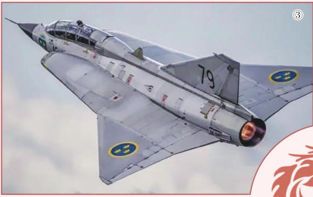 J-35“龙”式战斗机(图③)是瑞典萨博公司在20世纪50年代研制的一款先进超音速截击机,用于拦截苏联的高空高速轰炸机。当时,萨博公司不具有相关技术储备,为满足瑞典空军提出的性能要求,设计师大胆采用双三角翼、无尾翼气动布局,并获得成功。