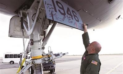 美空军人员在一架即将退役的KC-10加油机起落架上标注信息。