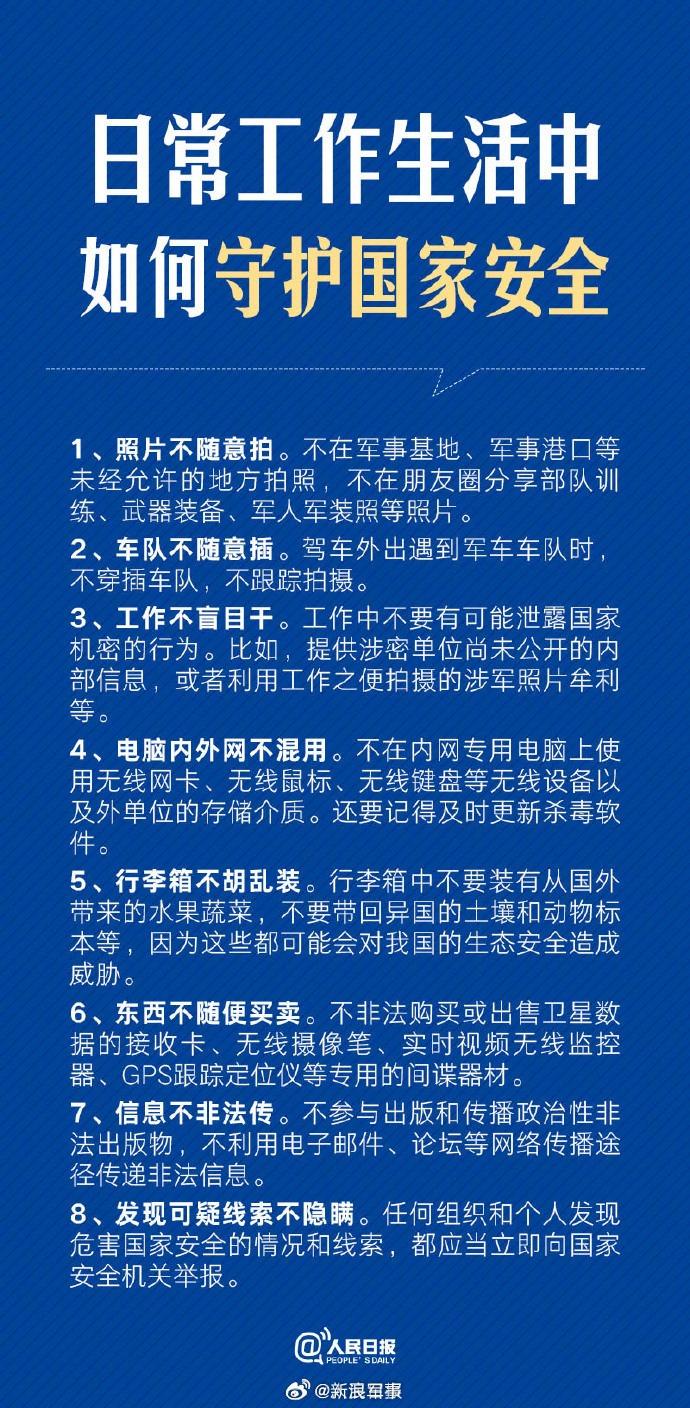 什么是国家安全?总体国家安全观涵盖哪些重点领域?哪些人群容易成为间谍策反的目标?日常工作生活中,守护国家安全要做到8个不。 国家安全无小事,转发提醒!(人民日报)
