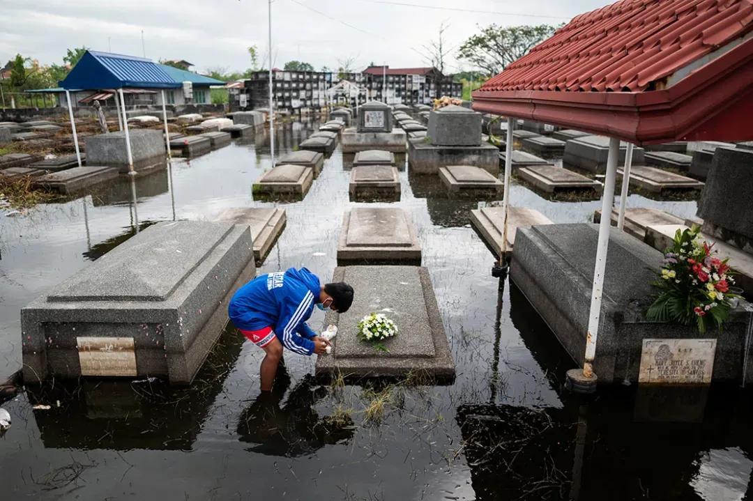 2021年10月,新冠疫情席卷菲律宾,一名男子在洪水淹没的公墓点燃蜡烛,当时许多市民对是否接种疫苗犹豫不决。
