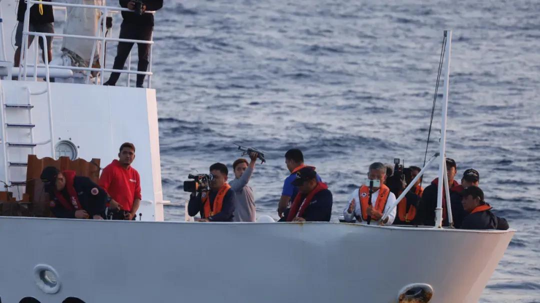 2024年3月,在仁爱礁附近海域跟随菲方船只进行非正常运补的菲律宾媒体记者,正试图放飞无人机拍摄我海警依法阻拦画面,准备进行恶意炒作。