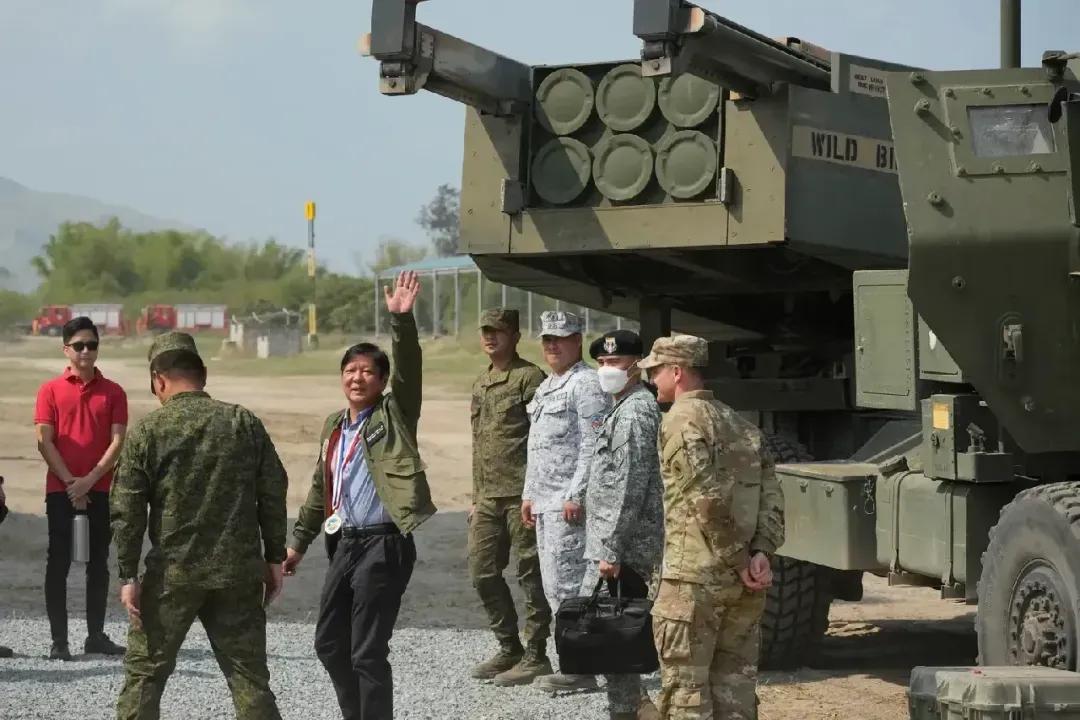 2023年4月,菲律宾某海军基地,在美菲“肩并肩”联合军演期间,马科斯在美国“海马斯”火箭炮旁挥手致意。