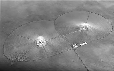 据公开报道,“双塔一机”光热储能电站的主体部分是2个巨大的圆形阵列,每个阵列中心都有一个约200米高的吸热塔。