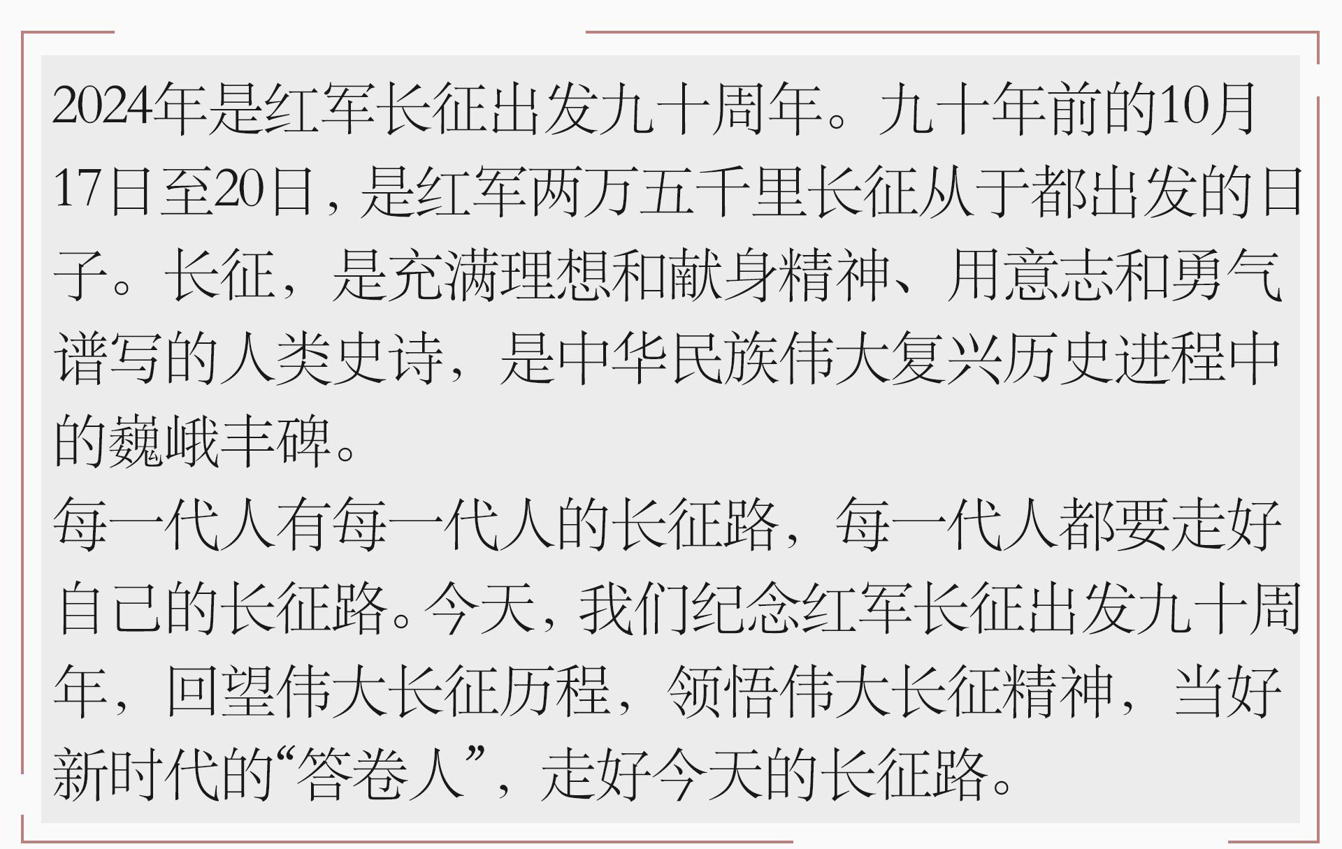 长征胜利启示我们:人民群众有着无尽的智慧和力量,只有始终相信人民,紧紧依靠人民,充分调动广大人民的积极性、主动性、创造性,才能凝聚起众志成城的磅礴之力。