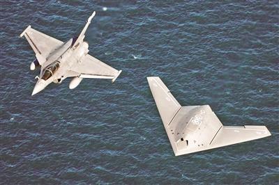 法国“神经元”无人机(右)与“阵风”舰载机协同飞行。