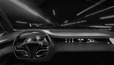 某智能汽车的设计概念图上,汽车挡风玻璃可以生成虚拟的3D导航信息,驾驶员无需低头即可获取关键信息。资料图片