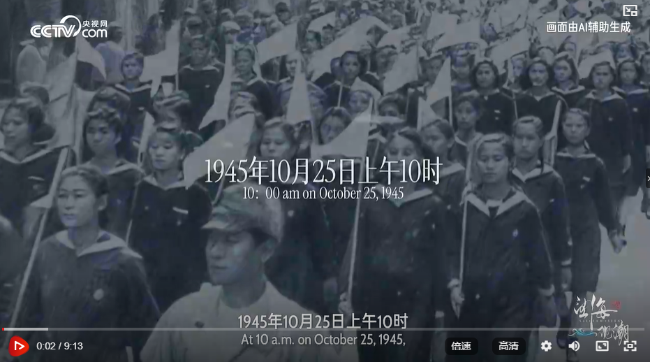 1945年10月25日,中国战区台湾省受降仪式在台北举行,至此台湾、澎湖列岛重归中国主权管辖之下。从《开罗宣言》《波茨坦公告》《日本投降书》,到联大第2758号决议,一系列国际法文件环环相扣,早已确认中国对台湾的主权,不容辩驳。