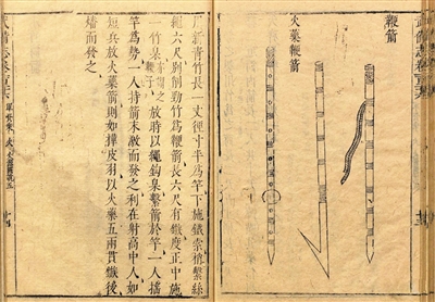 《武经总要》中绘制的宋朝火药鞭箭和鞭箭。资料图片