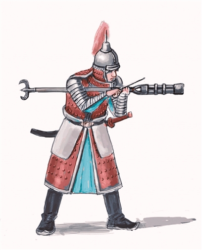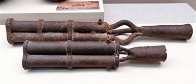 第二种构造是将两支单管手铳背向安置在一根长柄的两端,铳口均向外,可实现两头分别射击,代表性制品为两头铜铳。