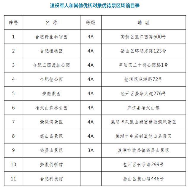 优待对象凭《中华人民共和国退役军人优待证》《中华人民共和国烈士、因公牺牲军人、病故军人遗属优待证》,在合肥市行政区域内免费乘坐公交(不含定制公交、网约公交、旅游专线、临时专线等非常规公交)、轨道交通;免门票参观游览市属国有博物馆、纪念馆、美术馆等公共文化设施和实行政府定价或指导价管理的公园、展览馆、名胜古迹、景区(见附件1),景区其他收费项目除外。