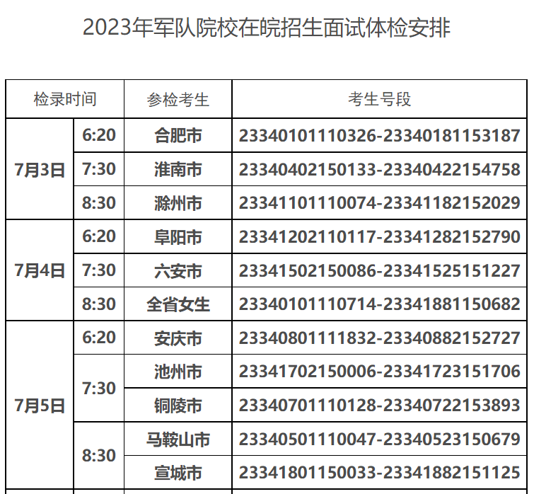 7月1日,安徽省教育招生考试院发布公告,公布2023年军队院校在皖招收普通高中毕业生面试体检控制线及体检安排。具体如下: