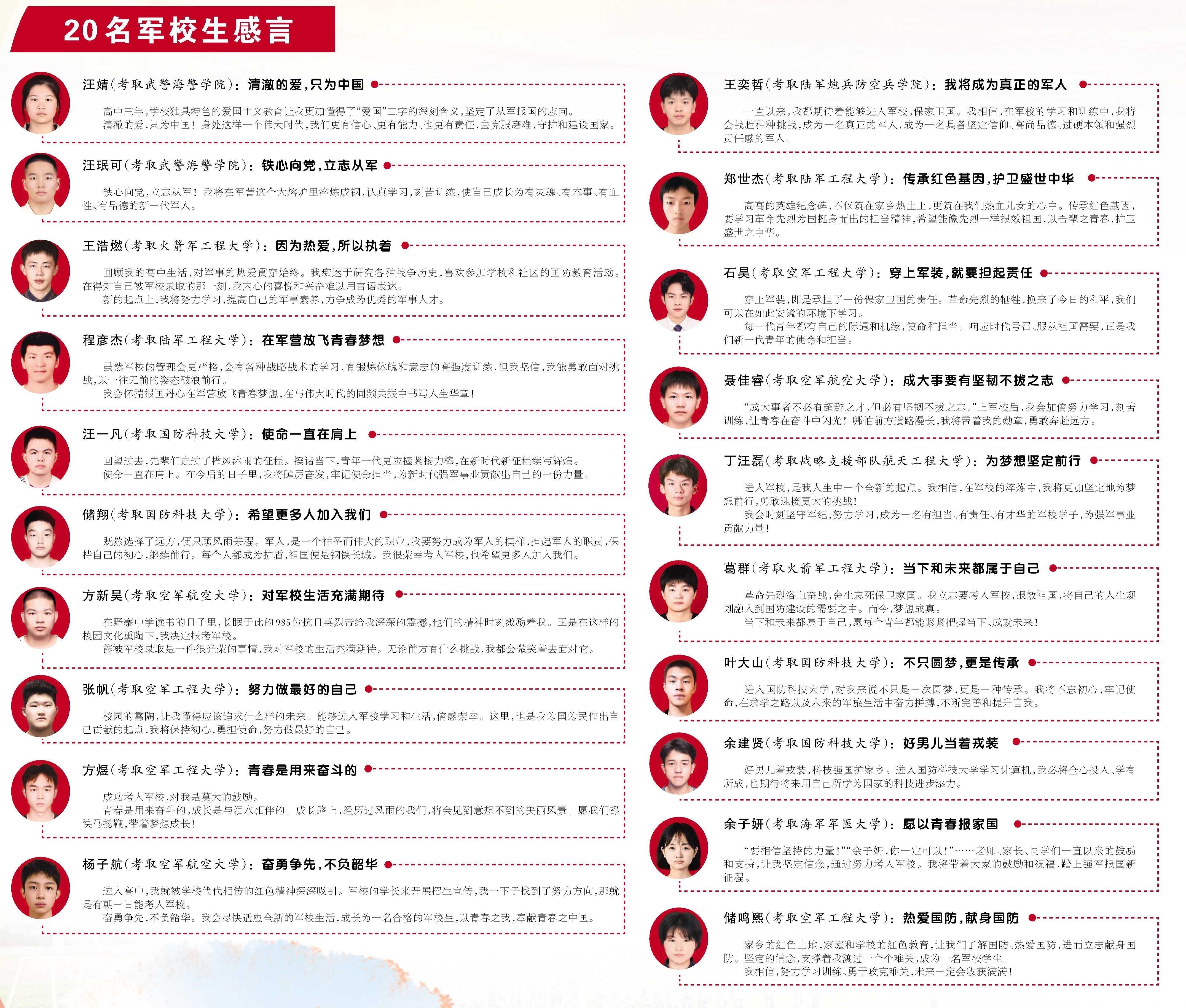20名学生每人写了一段心里话,表达他们即将成为军人的自豪和光荣,并表示学成毕业之际,恰逢建军100周年,一定会保卫好祖国,做到“强国有我”。