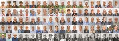 摄影作品《百名跨过鸭绿江的黄山籍志愿军老战士》(最后一排黑白照片为近年离世的老兵)。倪国初摄制