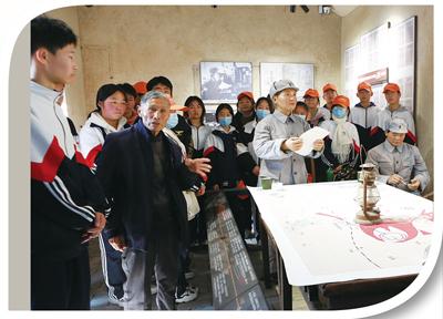 李华松给参观的学生讲述淮海战役总前委指挥作战的故事。