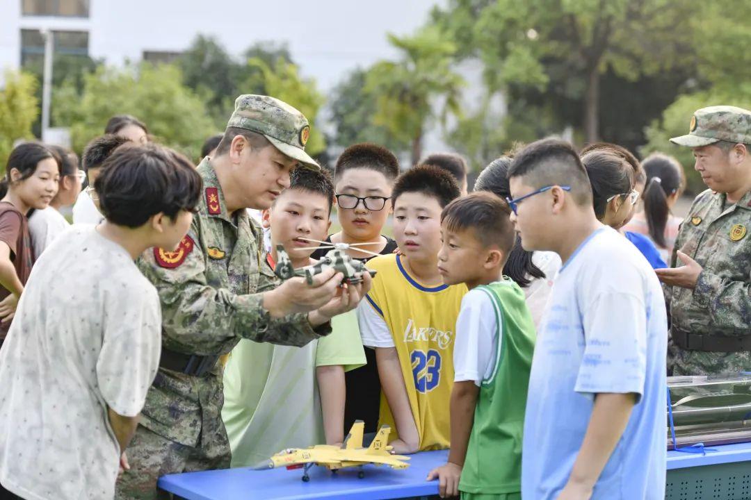 9月6日,安徽省合肥市庐阳区人武部工作人员走进三十岗乡古城小学开展“全民国防教育月”活动。图为庐阳区民兵向学生讲解装备模型。(来源:中国国防报 徐伟摄影报道)