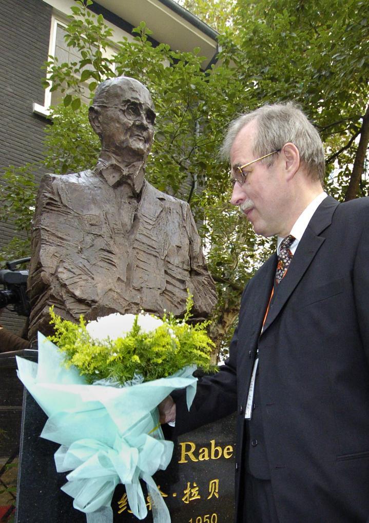 2006年10月31日,约翰・拉贝的孙子托马斯・拉贝向拉贝纪念塑像献花。 新华社记者 孙参 摄