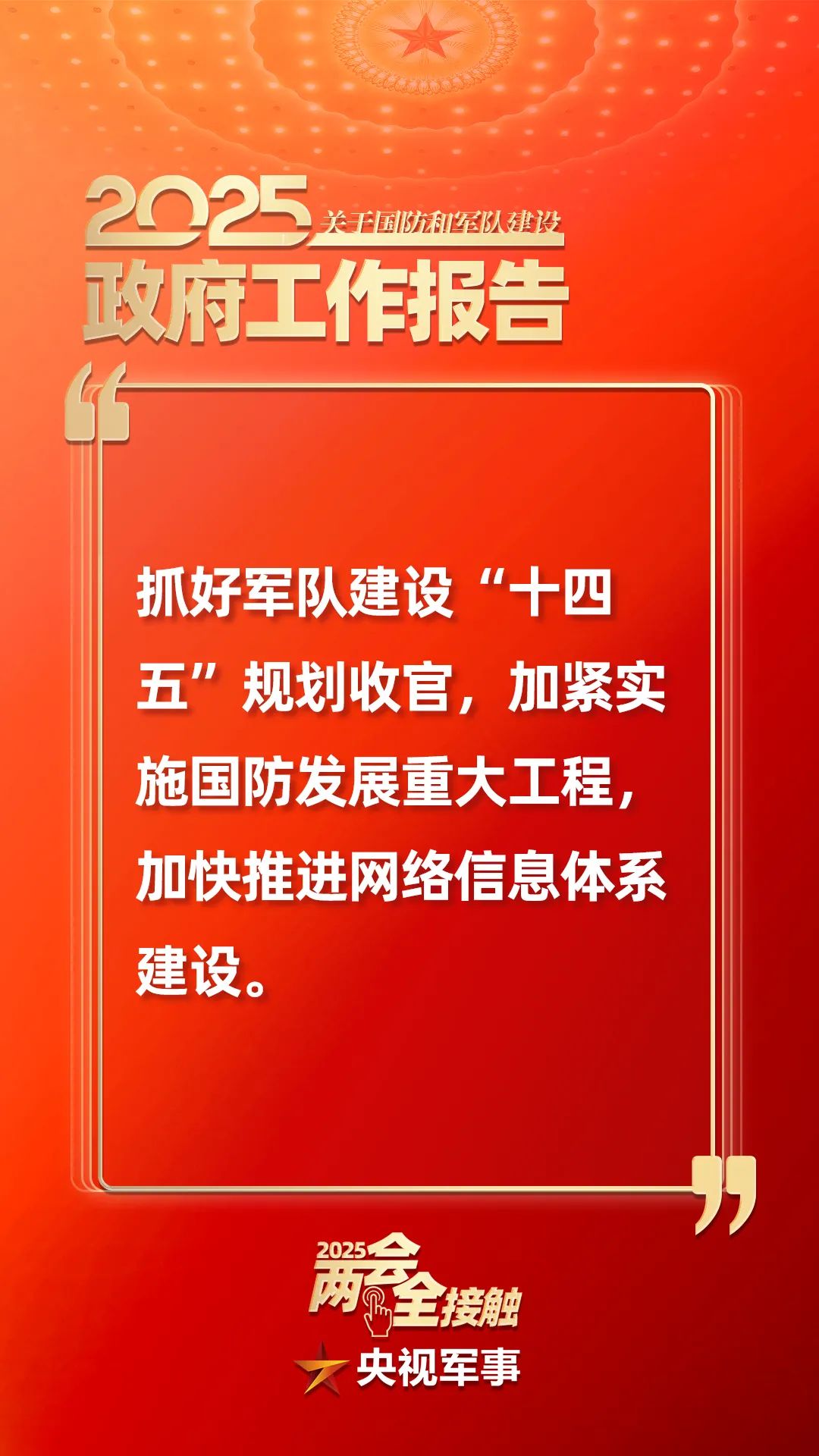 国务院总理李强表示,新的一年,要抓好军队建设"十四五"规划收官,加紧实施国防发展重大工程,加快推进网络信息体系建设
