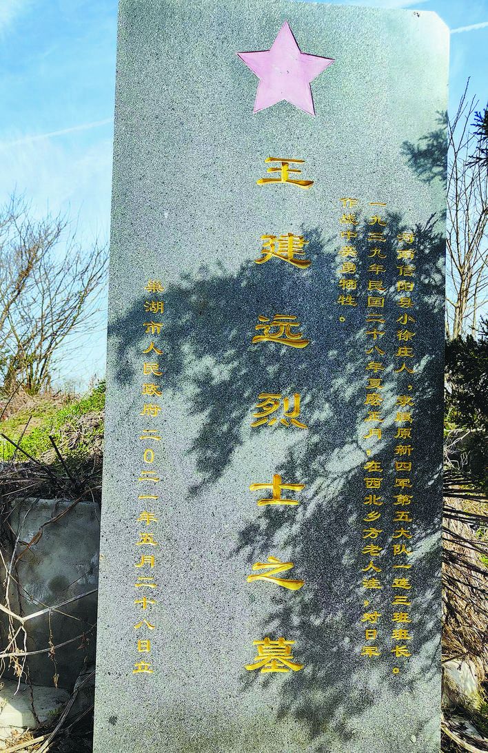 “新四军第五支队第一连三班班长王建远,年二十一岁,河南信阳县小徐庄人,于民国二十八年夏历正月初三日,柘皋西北乡方老人垄抗战殉国”。在巢湖市柘皋镇的一块墓碑上,这段墓志铭历经八十余载风雨侵蚀,字迹虽已斑驳,却如不灭的火种,诉说着一段跨越三代人的动人故事。