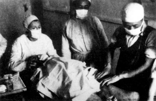 1939年,在安徽省宣城市泾县云岭镇,新四军军医处医务主任宫乃泉(右一)与加拿大护士琼·尤恩(左一)等为战士做手术,照片由新四军军长叶挺拍摄。