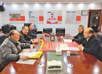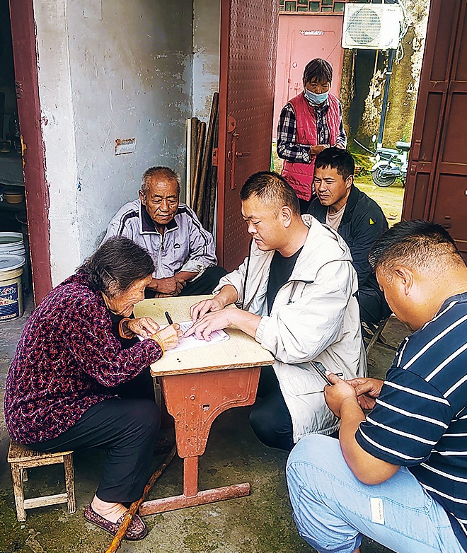 郭清杰(左三)请刘圩村老人为口述材料签证明书。李 宝摄