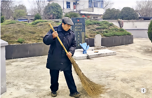 童传家在新四军五烈士墓园中清扫。