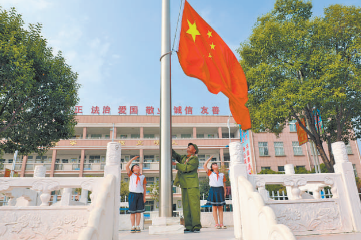 晨曦微露,金色的阳光唤醒了校园。百岁抗美援朝老兵王志新身着心爱的军装,走上萧县实验小学升旗台,在雄壮的《义勇军进行曲》中,将一面五星红旗缓缓升起。