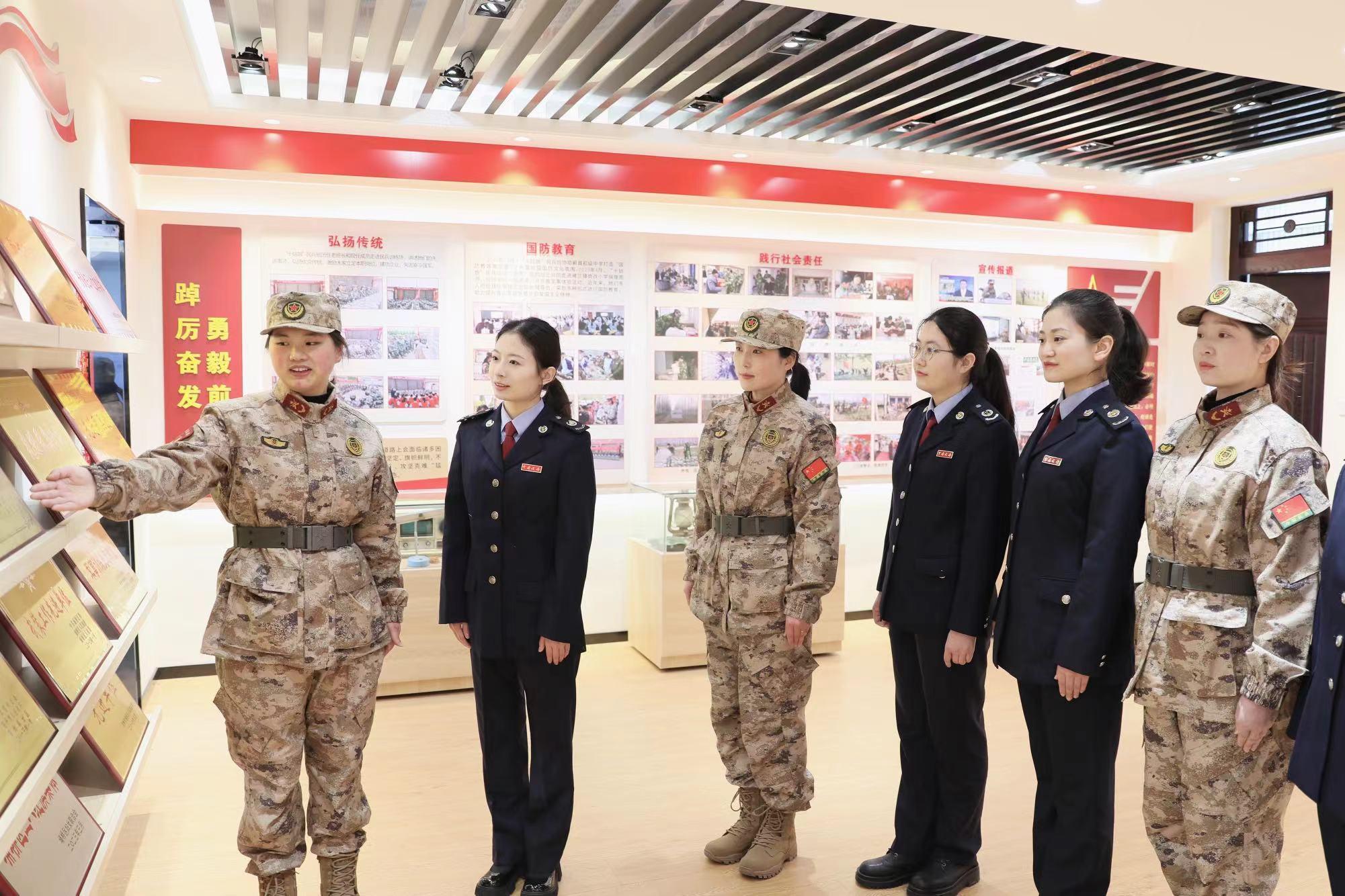 蕲县镇“十姑娘民兵班”自1983年建班以来,姑娘们能始终牢记使命重任,传承红色基因,坚持练技能当尖兵,艰苦创业做奉献。如今,40多年过去了,“十姑娘”民兵班的姑娘们换了一茬又一茬,唯一不换的是民兵班优秀的传统精神,的确巾帼不让须眉,不论是参加社会建设还是军事训练,姑娘们都同男兵比斗志、拼干劲,经过多年勤学苦练,她们奉献社会,扶贫助残,一度赢得人民群众称赞,成为一支闻名全国的民兵队伍。在进行完队列训练后,“十姑娘”民兵班成员带领着埇桥区税务局的姑娘们参观了民兵班荣誉室。