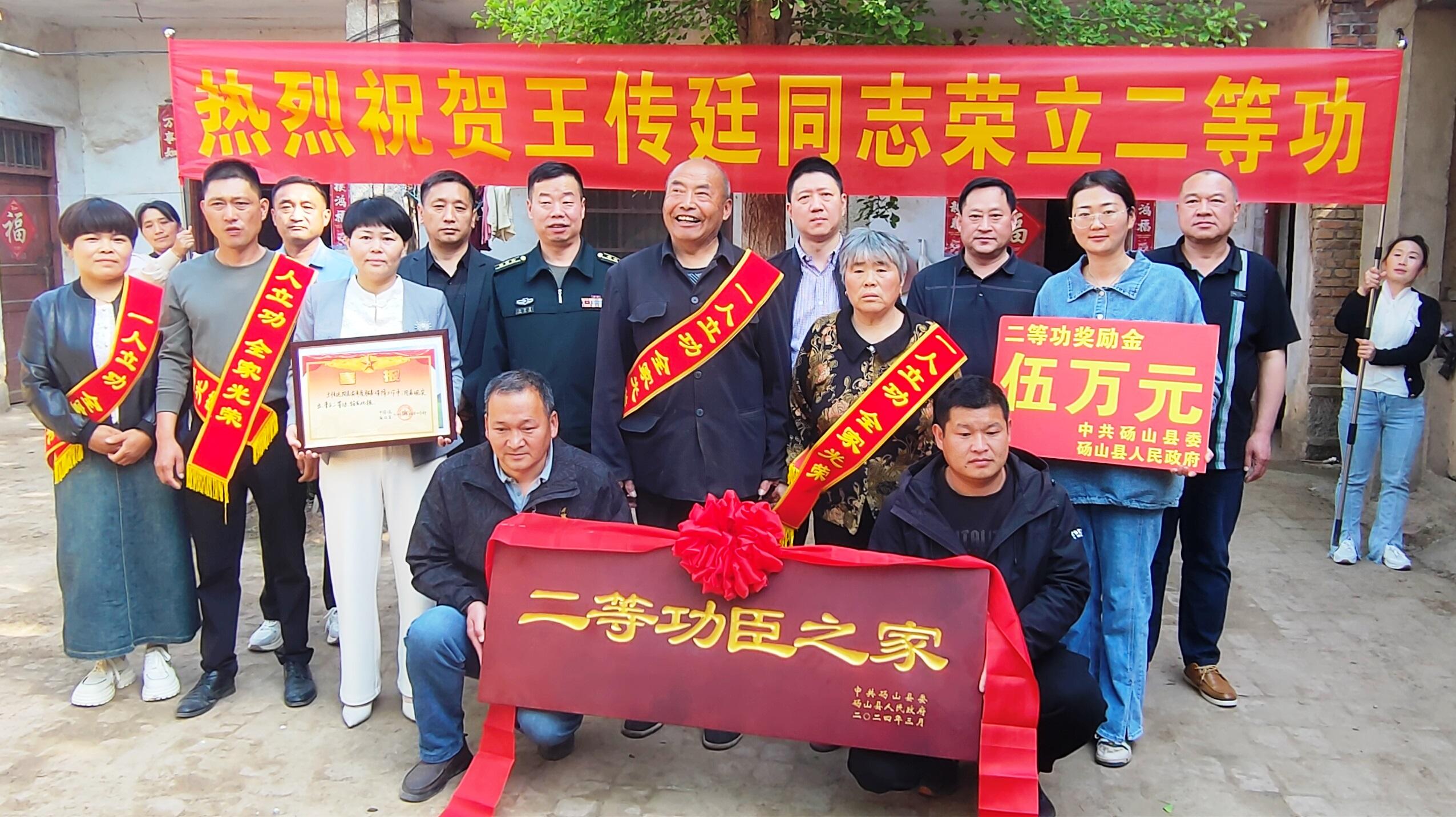 仪式现场,唢呐喧天、鞭炮齐鸣,镇、村干部举着横幅,抬着功臣牌匾,军人家属身披绶带,手捧奖状,在邻里乡亲的共同祝贺和见证下,军地领导将二等功喜报、牌匾和慰问金送到功臣家中。随后,赫荣杰、王云勇与军人父母亲切交谈,并对王传廷所取得的荣誉表示祝贺,感谢他们为国家、部队培养了优秀人才,为家乡增添了荣誉,希望他们一如既往地鼓励和支持其工作,让其安心服役,继续苦练本领,在部队再立新功,为家乡再添光彩。同时安排随行人员,要加大宣传力度,营造浓厚尊崇氛围,将二等功臣载入县志,进入荣誉墙。