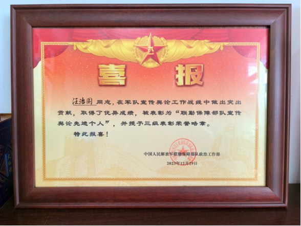 5月17日,安徽省歙县人武部、歙县退役军人事务局及许村镇党委政府代表共同前往现役军人汪治国家中,为其家庭送上了一份特殊的喜报。汪治国同志在军队宣传舆论工作战线中做出突出贡献,荣获“联勤保障部队宣传舆论先进个人”称号,并被授予三级表彰荣誉略章。