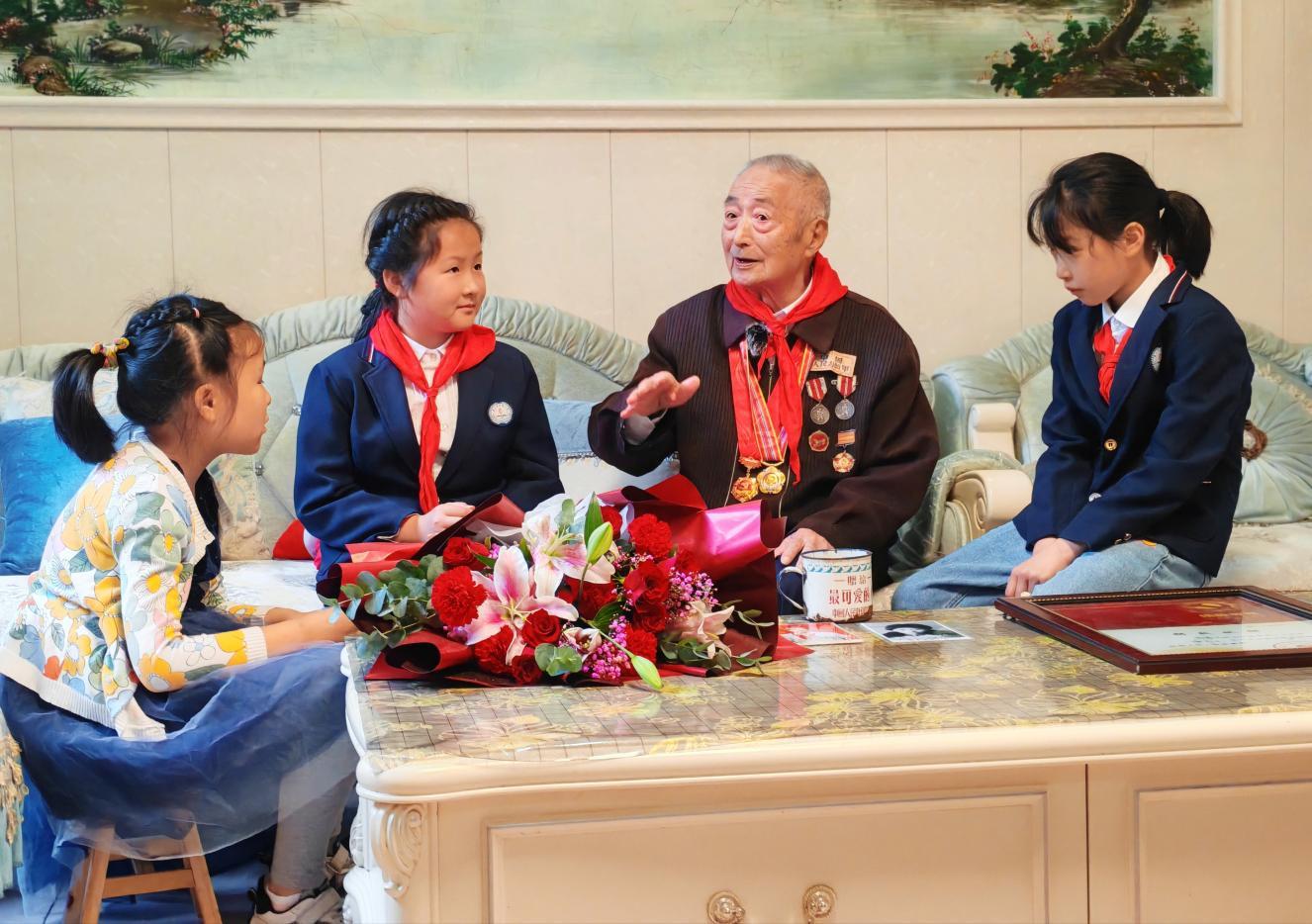 “齐爷爷,齐爷爷,我们来看您了。”“小朋友们好。”黄山市屯溪区抗美援朝老兵齐家义家里,一下子涌进来好几个小学生,她们一进来就围着齐老爷子,向他献花并给他戴上红领巾。
