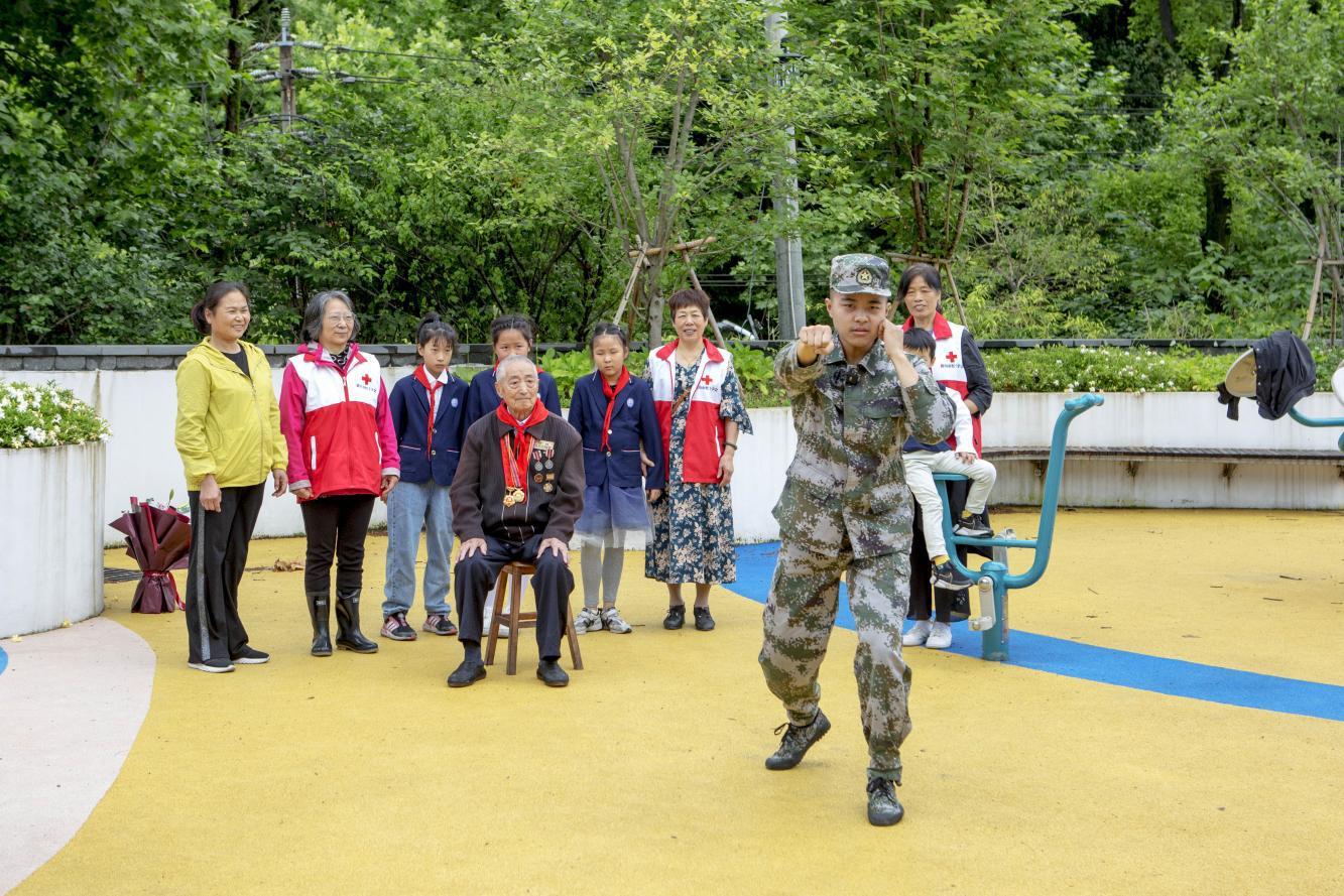2022年退役的黄岩今日也特意赶过来看望齐老,和来访的小学生一起向齐老敬礼,还展示了格斗术第一套,赢得大家热烈掌声。