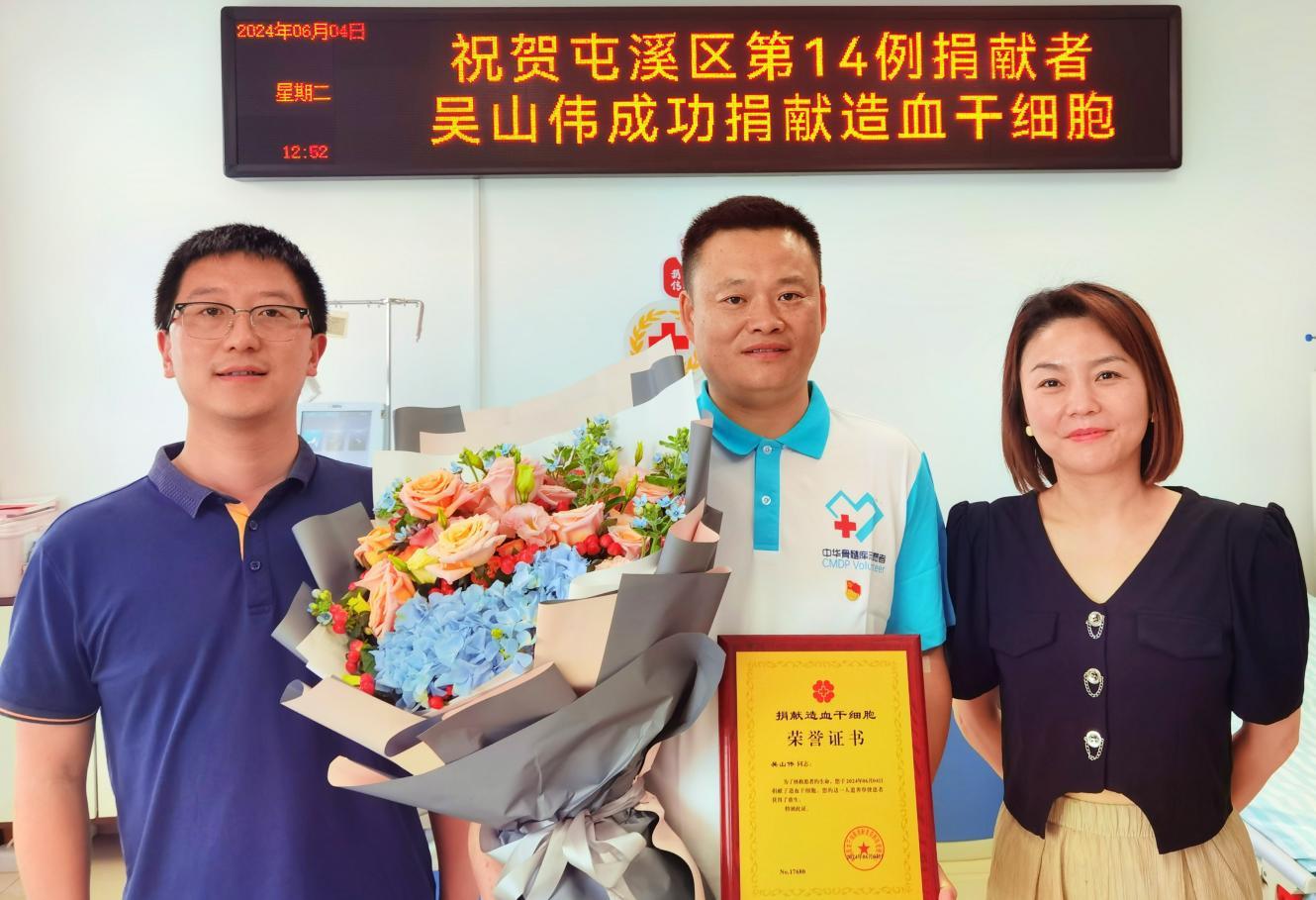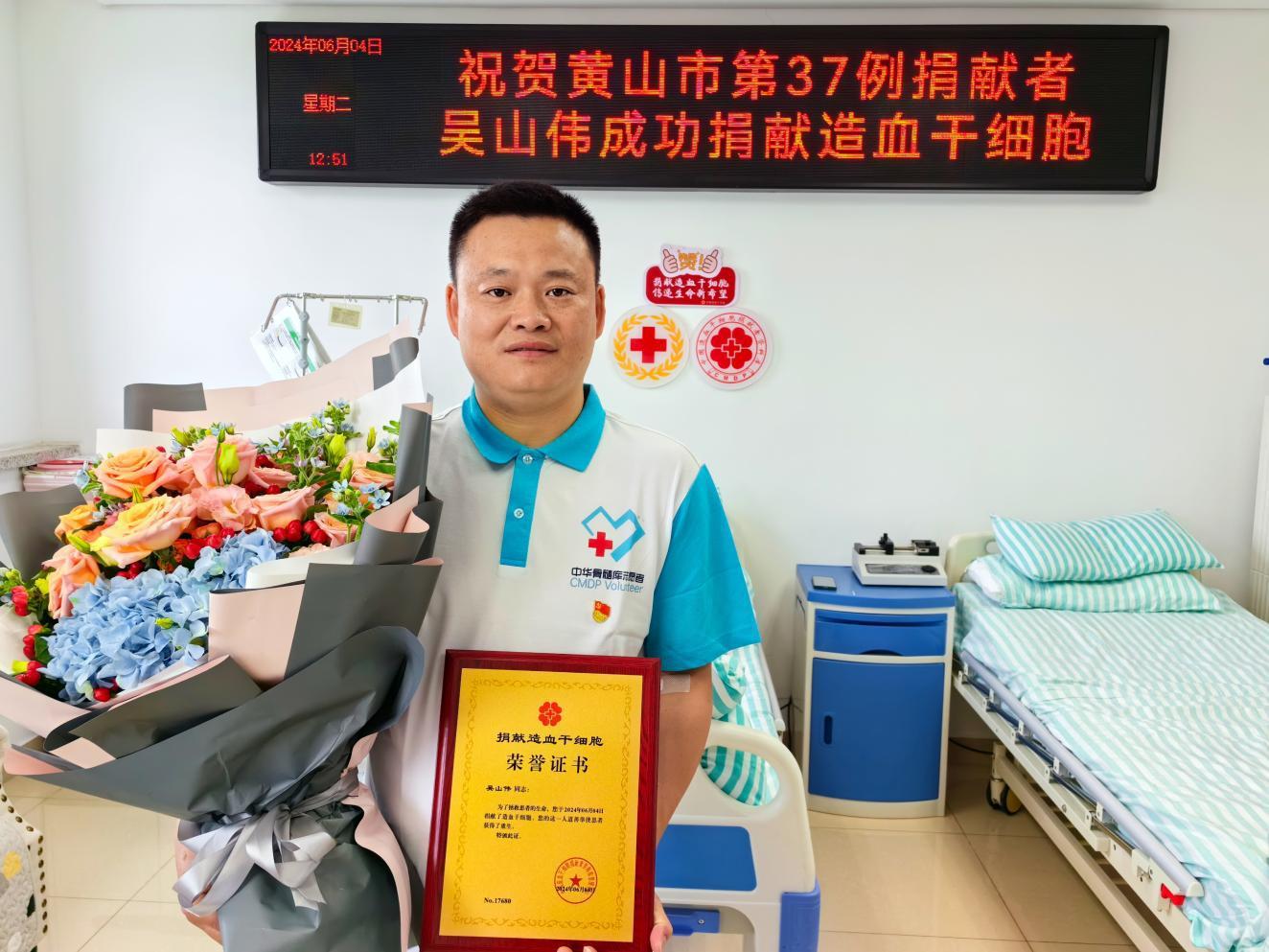 捐献造血干细胞,传递生命新希望!6月4日上午,历经4个小时,黄山市退役军人吴山伟在安徽省立医院顺利完成252毫升造血干细胞混悬液的采集,为远方一名陌生的患者送去生的希望,成为安徽省第625例、全市第37例、屯溪区第14例造血干细胞捐献者。
