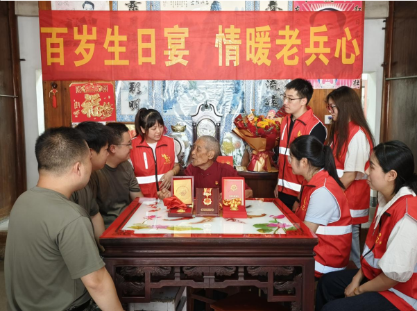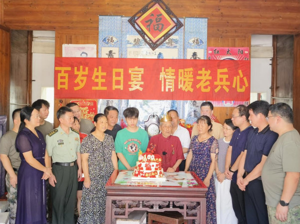 “祝你生日快乐,祝你生日快乐……”阵阵祝福声和欢笑声从老兵江志祥家中传来,来自徽州区人武部、区退役军人事务局、富溪乡政府等单位的工作人员带着鲜花和生日蛋糕来到江志祥家中。大家围坐在老人身边,听他讲述当年英勇抗敌、保家卫国的动人故事。百岁老兵丰富的战斗经历和各类勋章,在此刻也变成了珍贵的红色教材,给在场的每一个人上了一堂生动感人的红色党课。