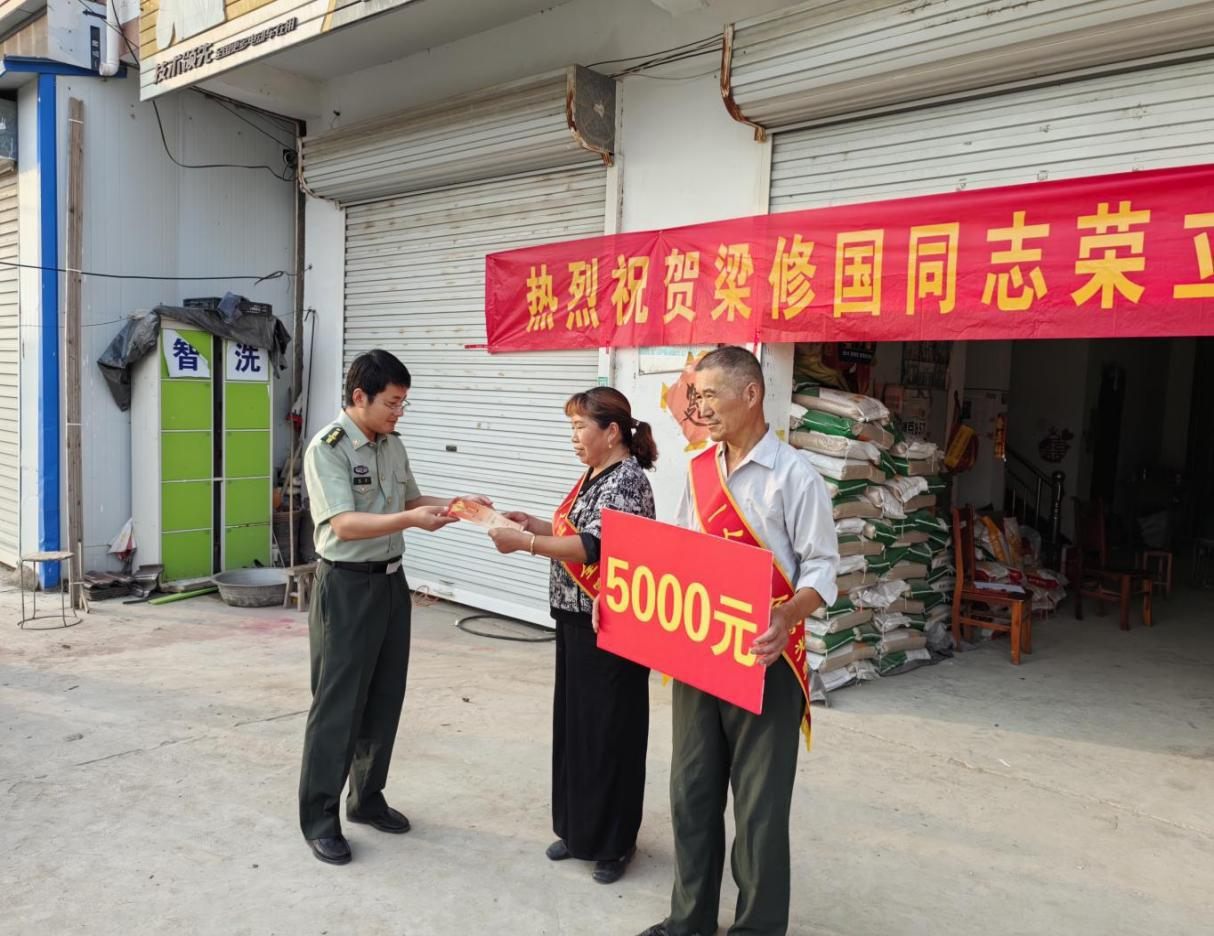 军营建功勋,家乡传美名。近日,泗县大路口镇武装部、退役军人服务站有关部门组成慰问团,为荣立“三等功”的现役军人梁修国家属送上“三等功”喜报。