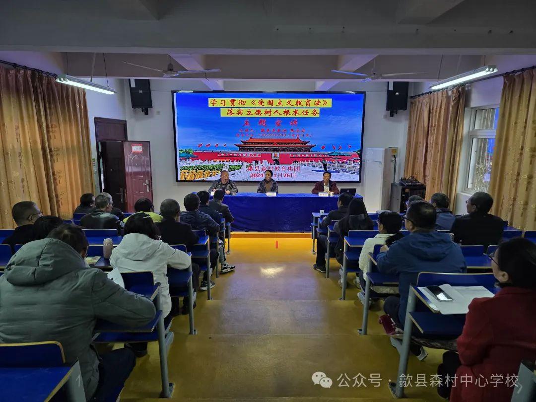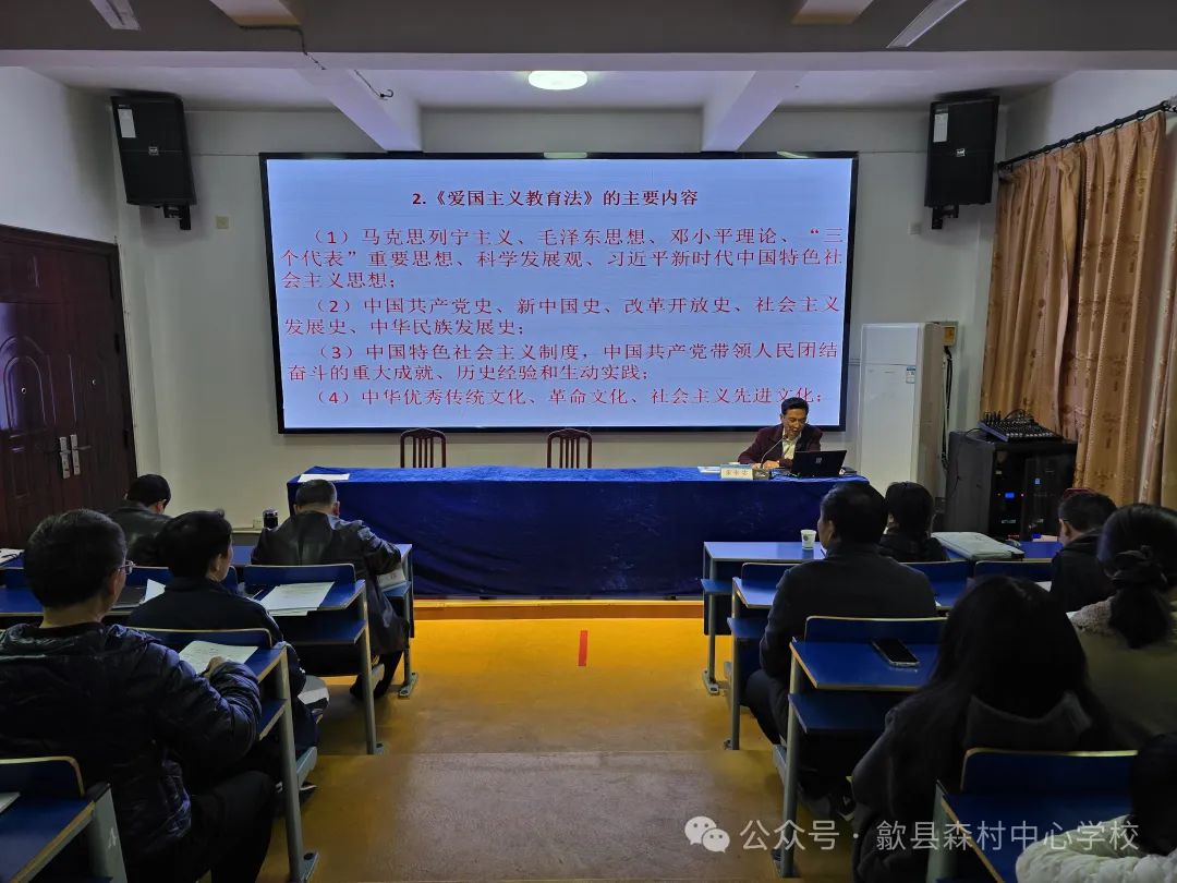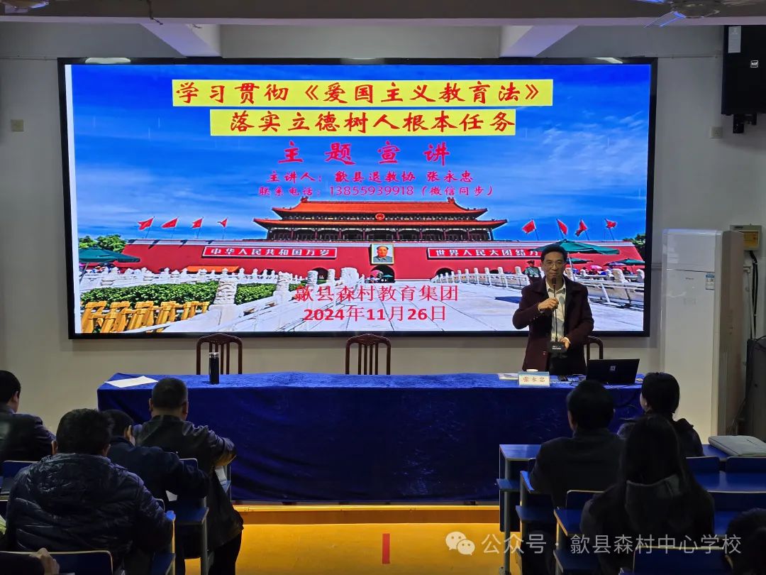 为深入学习贯彻《爱国主义教育法》,歙县“五老”讲师团于2024年11月26日下午来到歙县森村教育集团总校(歙县森村中心学校),开展了一场以“学习贯彻《爱国主义教育法》,落实立德树人根本任务”为主题的宣讲活动,歙县“五老”讲师团成员、县退教协办公室主任张永忠老师为全校师生带来了一场深刻而生动的爱国主义教育盛宴。歙县教育局人事股干部汪珍、小洲、小川中心学校部分教师、歙县森村中心学校校本部全体教职工参加会议。本次宣讲活动由歙县森村中心学校党支部书记、校长汪紫军主持。