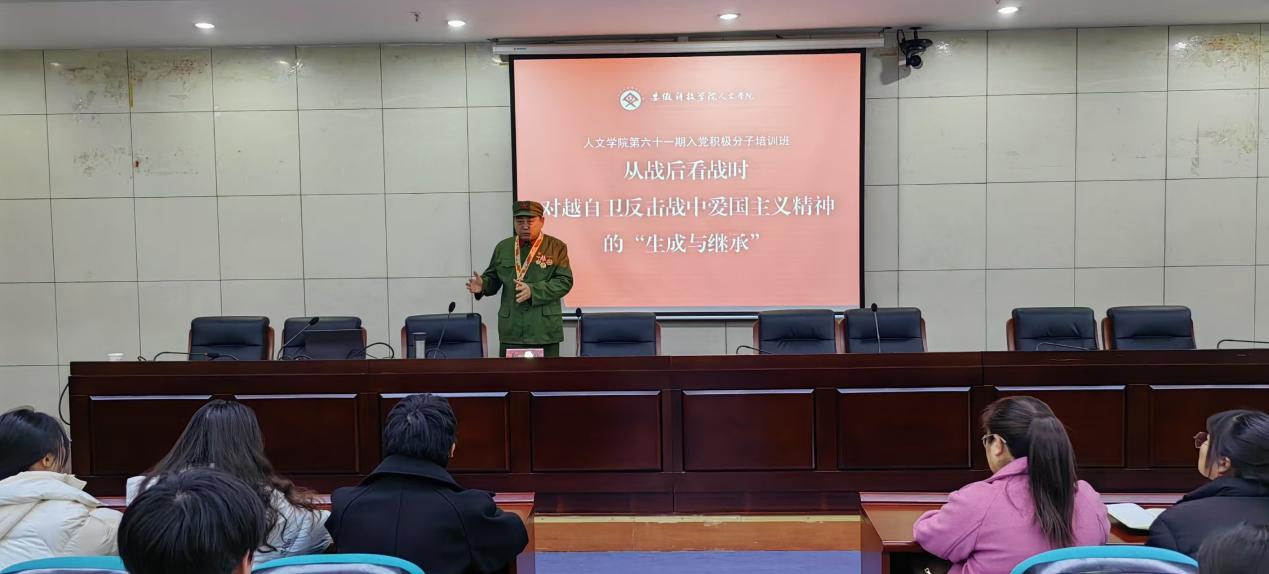 11月28日,凤阳县退役军人事务局联合安徽科技学院,邀请一等功臣、思政指导员郑世柱,以“从战后看战时 对越自卫反击战中爱国主义精神的‘生成与继承’”为题,为学院90余名入党积极分子、预备党员等带来了一堂别开生面的红色思想教育课。