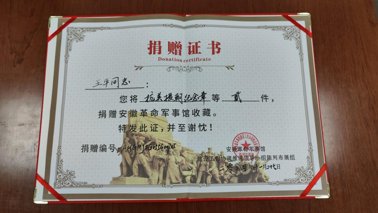 抗美援朝的硝烟已远,但一张张照片,一本本证书,一个个勋章,见证了志愿军将士们的烽火青春和保家卫国的峥嵘岁月。将这些珍贵的革命文物捐赠给安徽省革命军事馆,王平老兵希望它们能够成为更多人铭记历史、珍爱和平的生动教材。