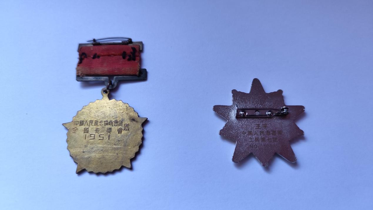 王平老兵捐赠的“抗美援朝纪念”勋章1枚、“中国人民志愿军工兵第七团NO:10131”勋章1枚。(反面)