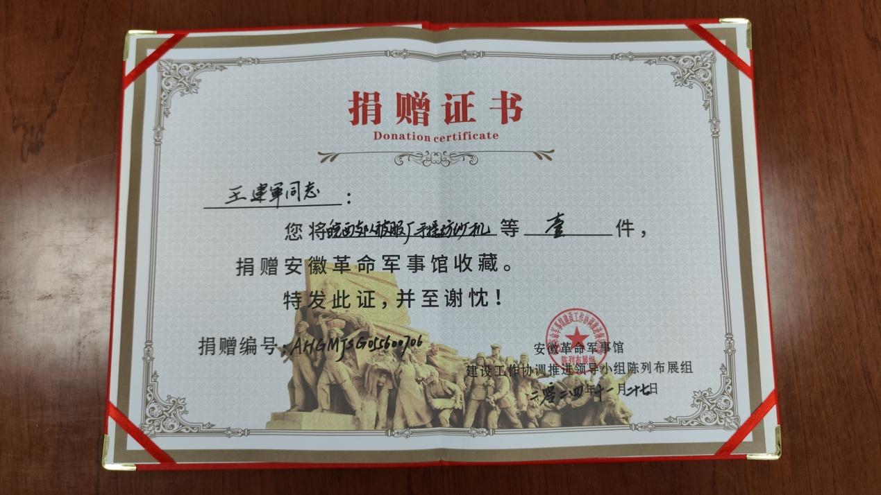 日期,潜山市五庙乡积极响应省委、省政府、省军区关于《革命文物史料征集公告》征集各类革命珍贵文物史料和藏品的号召。集中展示中国共产党在安徽领导武装斗争史、新中国国防建设成就和新时代强军兴军伟大实践,延伸展示安徽军事历史文化和军事地理信息,着力打造传承红色基因、宣扬强军成就、普及国防教育的红色殿堂。11月27日,潜山市五庙乡新建村抗美援朝老兵王平将珍藏73年之久的“中国人民政治协商会议全国委员会”赠送的勋章1枚和抗美援朝60周年发放的“王平 中国人民志愿军工兵第七团NO:10131”勋章1枚以及王学祝烈士后人王建军将珍藏77年久的1台“皖西支队被服厂手摇纺纱机”等军事文物共3件分别捐赠给安徽省革命军事馆。