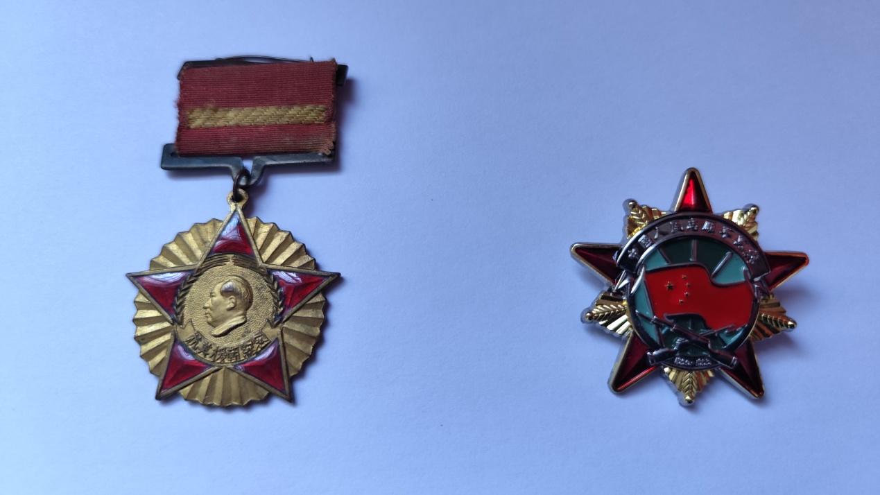王平老兵捐赠的“抗美援朝纪念”勋章1枚、“中国人民志愿军工兵第七团NO:10131”勋章1枚。(正面)