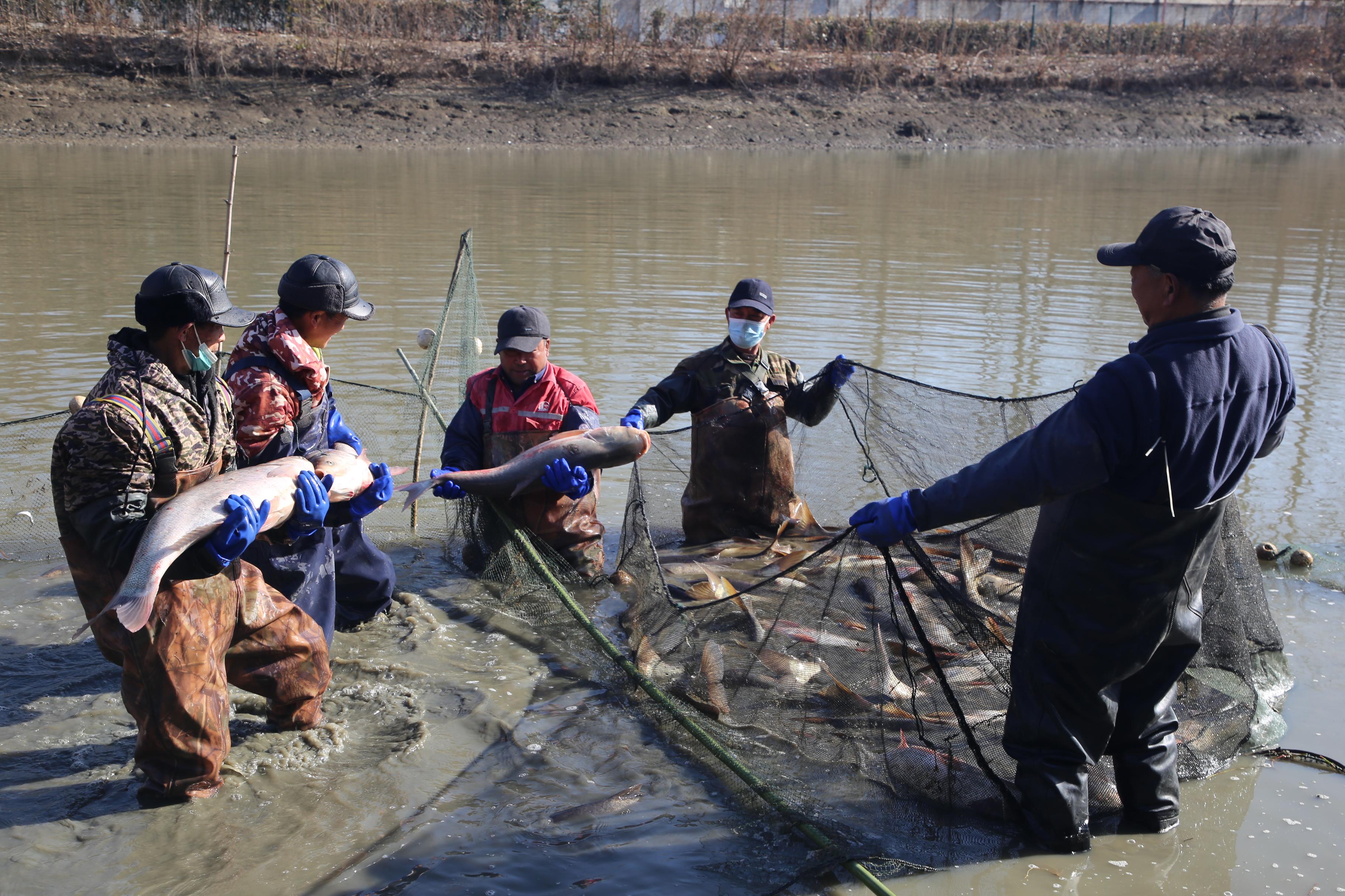 天长市杨村镇6名村民为空军驻王台子某部池塘捕捞肥鱼。曹基摄