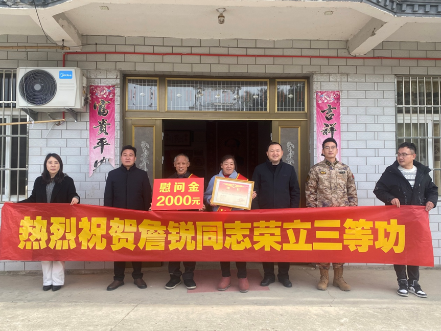 近日,太湖县退役军人事务局局长、弥陀镇党委主要负责同志及武装部长来到荣立三等功的现役军人詹锐家里送喜报。