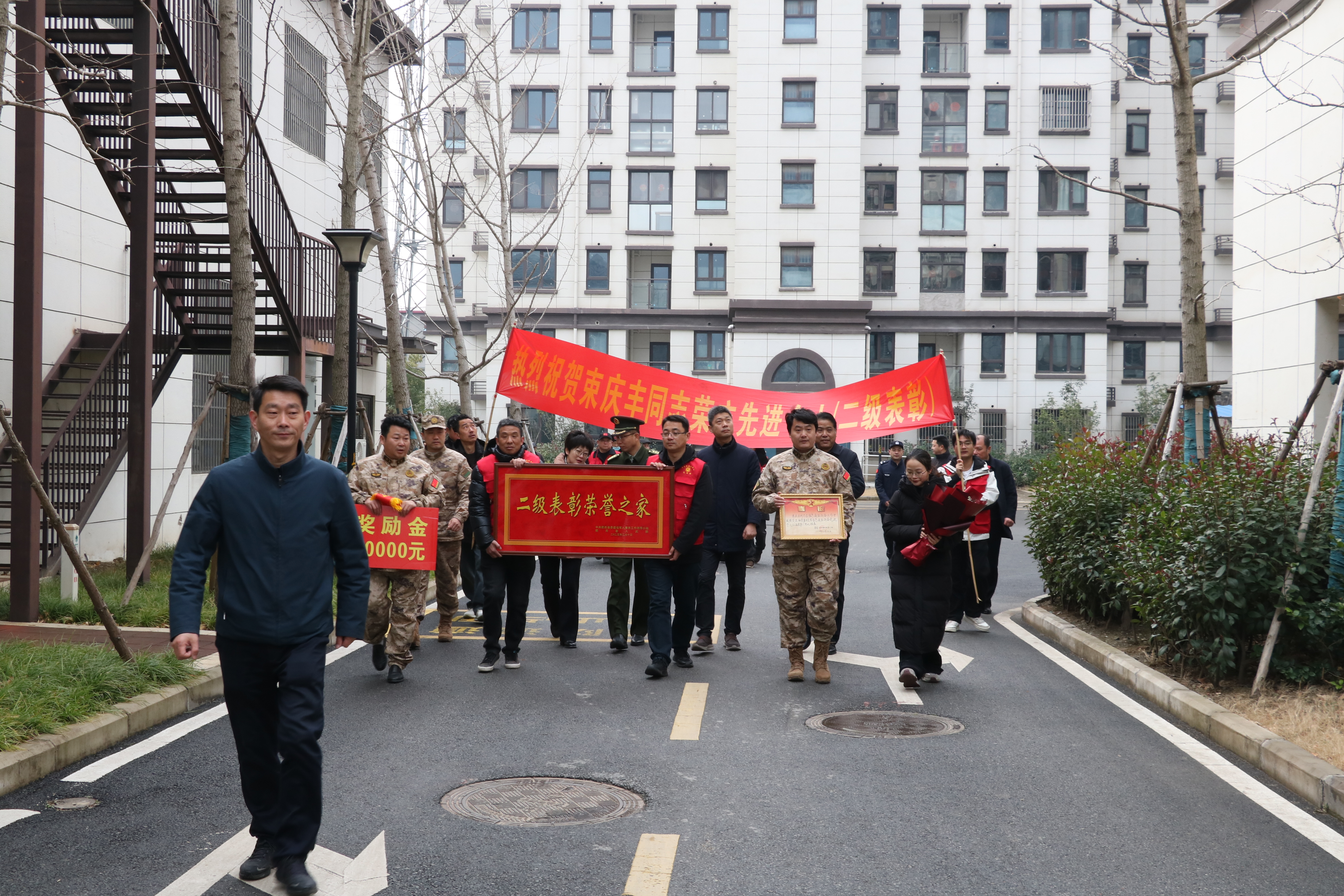 2月12日一大早,在热闹的锣鼓声中,肥西县委常委、人武部政委牛孝印,肥西县副县长、县公安局局长孙民,肥西县退役军人事务局局长孟建、丰乐镇党委书记吴丽君一行为荣立二级表彰现役军人束庆丰家庭送去“二级表彰荣誉之家”牌匾、喜报和慰问金。随后,丰乐镇镇长吴成稳、党委委员何向进、武装部部长盛诚为荣立三等功现役军人徐杰家庭送去喜报和慰问金。现役军人束庆丰、徐杰家中,欢庆热闹的氛围,引得周边群众纷纷驻足围观,共同见证这份荣耀时刻。