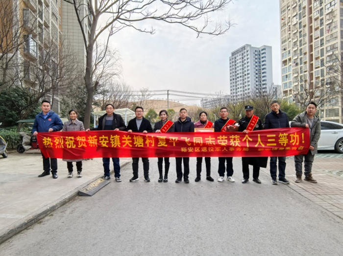 2025年2月19日下午,六安市裕安区新安镇关塘小区7号楼下,热闹非凡,引来很多群众驻足观看。原来是关塘村现役军人夏平飞在2024年年度工作中表现突出,在训练中身先士卒,表率作用强,荣立战备训练三等功。群众自发地为其鼓掌祝贺!