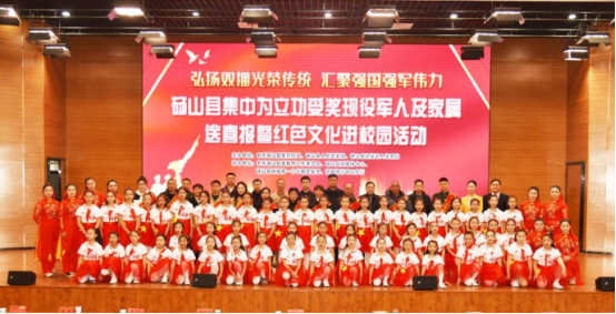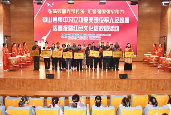 砀山军地集中为立功受奖现役军人及家属送喜报暨红色文化进校园活动在砀城一小举行,旨在弘扬新时代拥军优属光荣传统,传承红色精神,进一步营造双拥浓厚氛围。同时以此活动为契机,激发同学们以军人为榜样,树立远大理想,厚植家国情怀,努力学习知识,锤炼过硬本领,将来投身国防建设,为实现强国梦、强军梦贡献自己的力量。