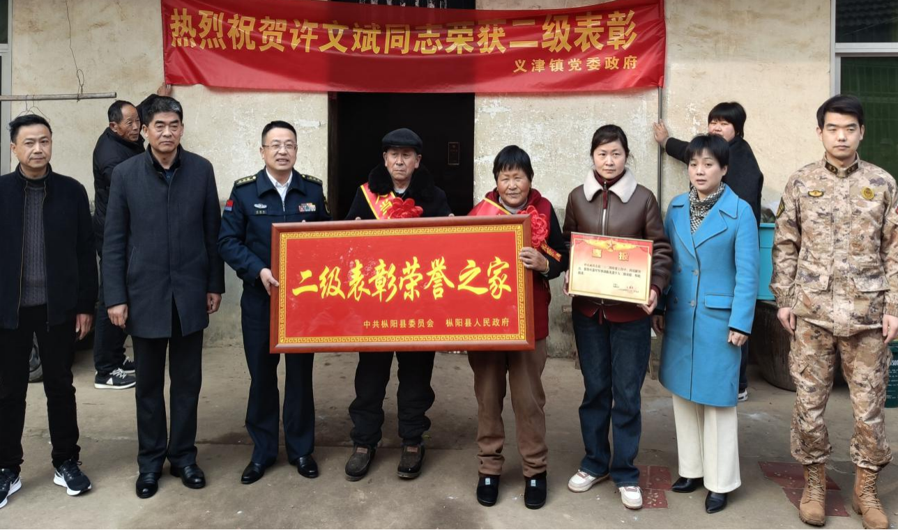 喜信传千里,荣誉励人心。2月26日,枞阳县委常委、人武部部长陈颖华与义津镇党委、退役军人事务局负责人上门为荣获得二级表彰的现役军人许文斌家庭送喜报。